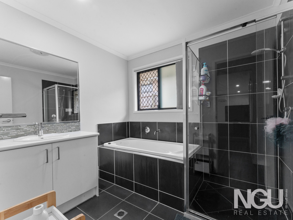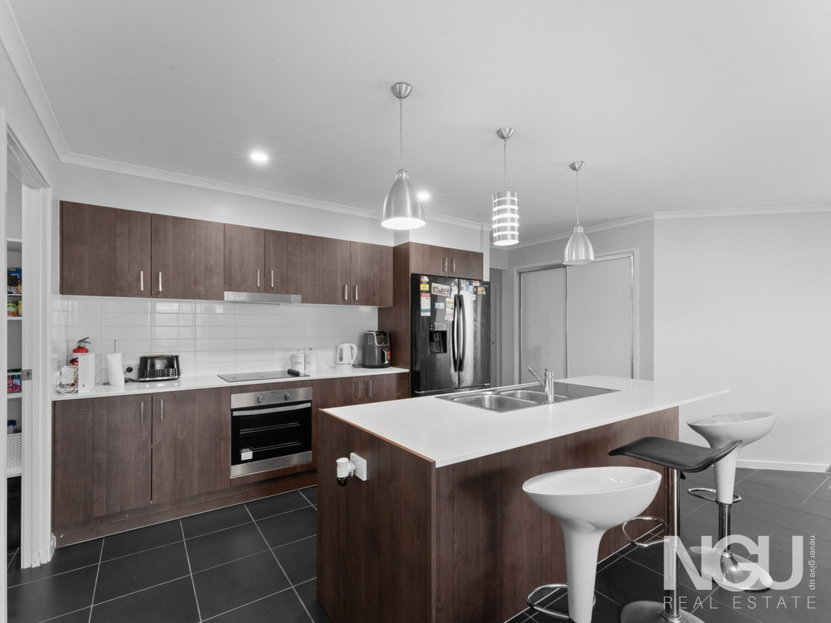 The heart of the home is the sleek, modern kitchen, equipped with stone benchtops, an island unit with a breakfast bar, a walk-in pantry, and ample cabinetry. Whether you’re whipping up weeknight meals or entertaining guests, this space is designed to make life easier. The main bathroom includes a bathtub, shower, and contemporary vanity, while the laundry provides plenty of storage and functionality with extra cabinetry.